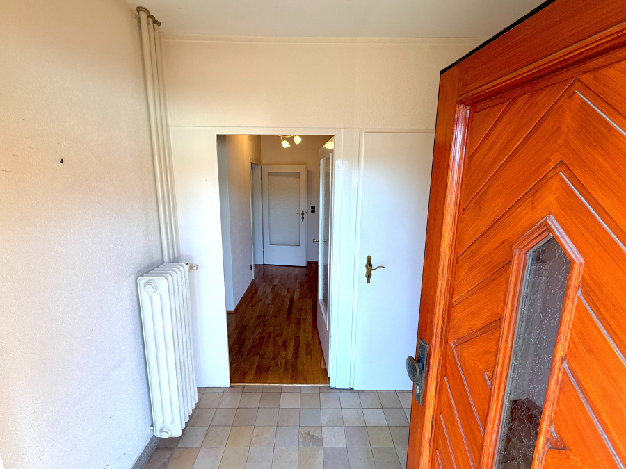 Beim Betreten des Hauses gelangen Sie in den Eingangsbereich mit Platz für eine Garderobe sowie direktem Zugang zum Keller. Der zentrale Flur erschließt alle Räume des Erdgeschosses. Linkerhand befindet sich das Gäste-WC mit Tageslichtfenster. Gegenüber liegt ein praktischer Einbauschrank, der zusätzlichen Stauraum für Haushaltsgeräte bietet. Ebenfalls vom Flur aus erreichbar ist die geschlossene Küche, die funktional geschnitten ist. Am Ende des Flures öffnet sich der Wohn- und Essbereich. Große Fensterflächen bieten einen Blick in den Garten. Von hier aus gelangen Sie direkt auf die sonnige Terrasse mit Markise. Der Garten ist überwiegend als Rasenfläche angelegt, von Sträuchern eingefasst und bietet Platz für Erholung sowie individuelle Gestaltungsmöglichkeiten.